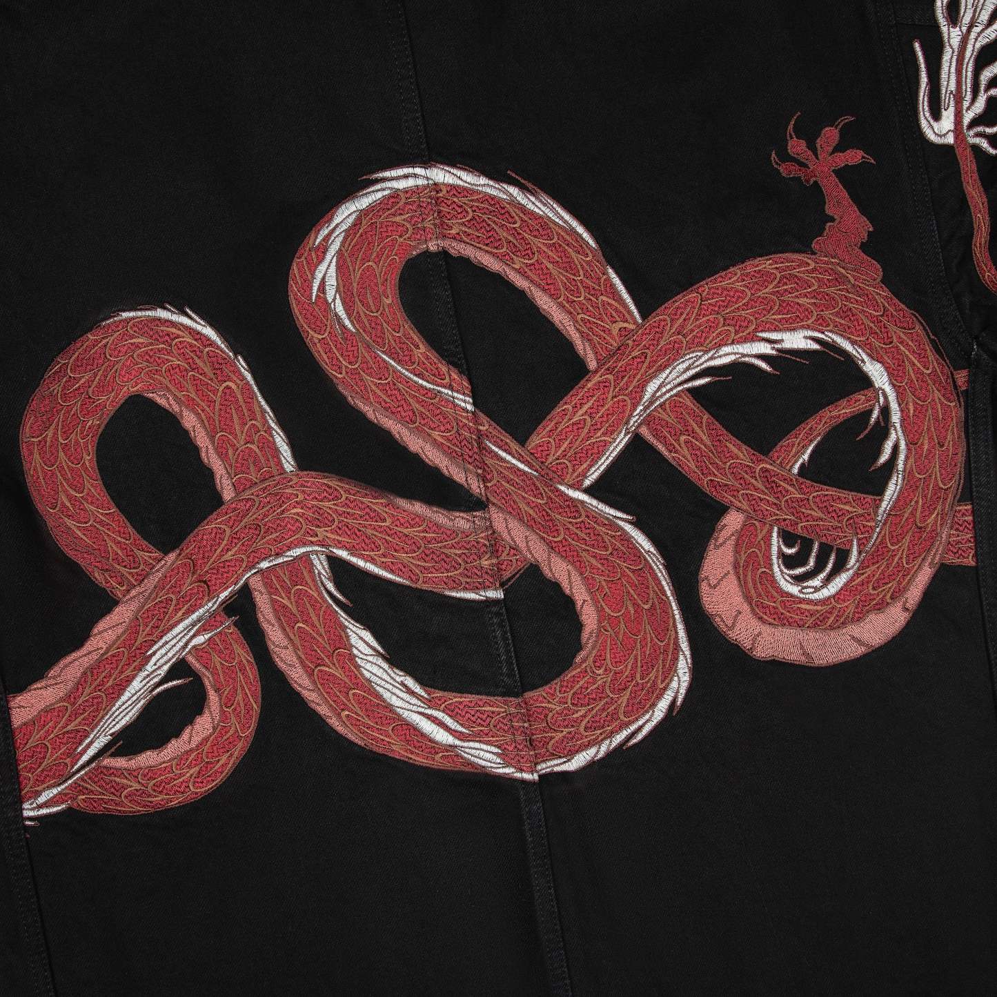 14oz denim / 460gsm brushed cotton hood / 100% cotton / embroidery on back and sleeves / pockets on front / custom buttons / fits true to size